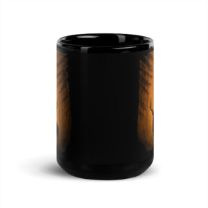 L’arrière-plan orangé contraste magnifiquement avec le noir profond du mug, créant une esthétique puissante et élégante.